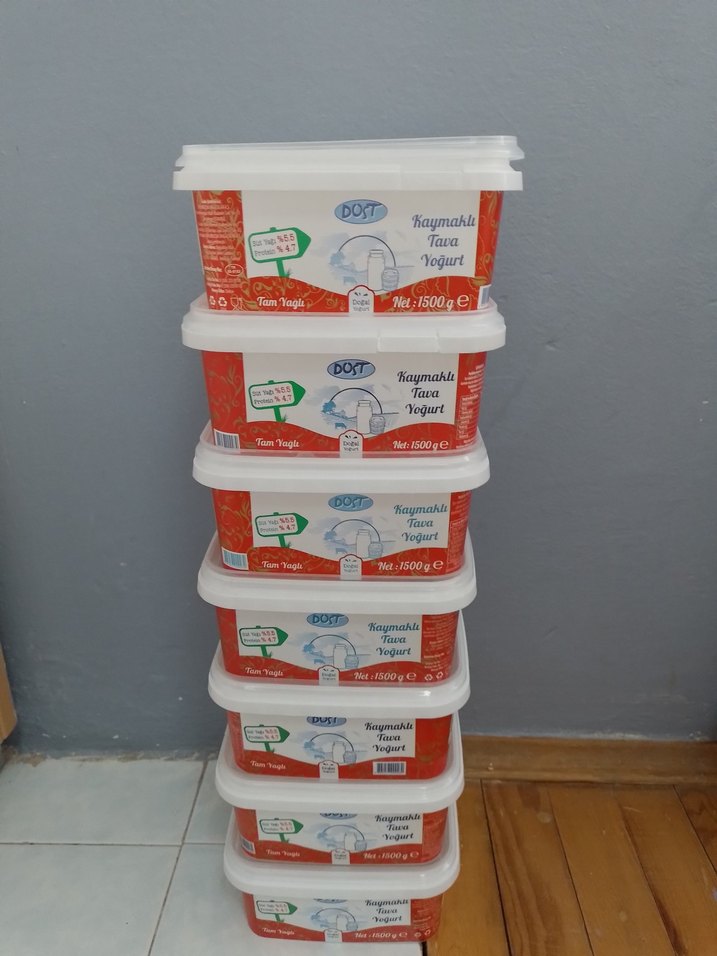 DOT markalı, 1500g kapasiteli beyaz yoğurt saklama kapları. Her biri kapaklı ve dikdörtgen formda. elimde fazladan dondurma kapları da mevcut onlarıda gönderiyorum