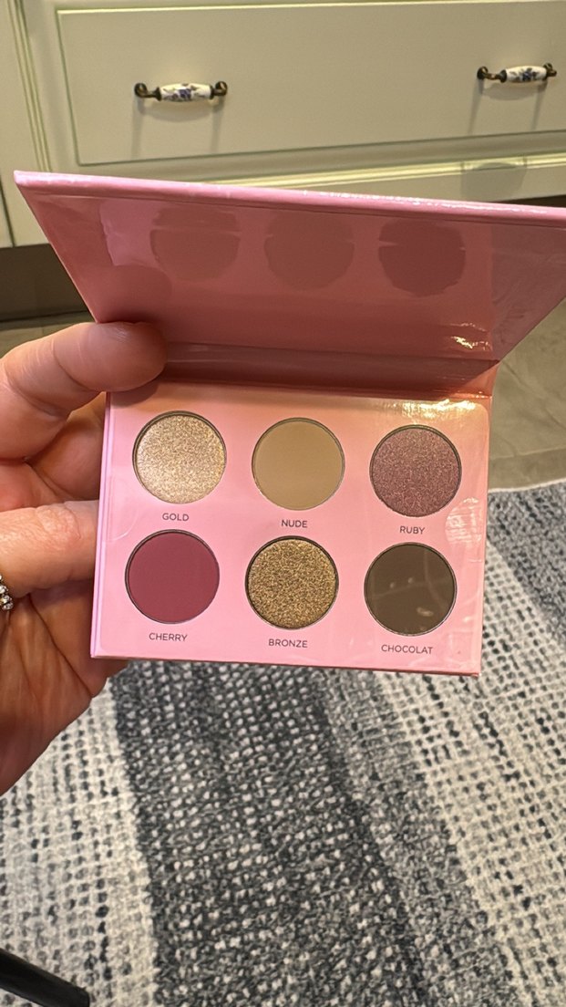 Altı renkli göz farı paleti; altın, nude, yakut, kiraz, bronz ve çikolata tonlarında parlak ve mat dokular sunar.