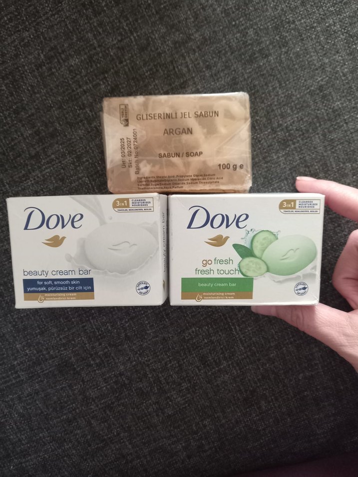 2 adet Dove güzellik krem sabunu ve tazeleyici go fresh salatalık sabun, nazik temizlik ve nem sağlar. 1 adet Argan yağlı gliserin sabunu ile besleyici bakım sunar. Yeni üçlü set birlikte fiyat. Farklı çeşitleri için sayfama bakabilirsiniz.