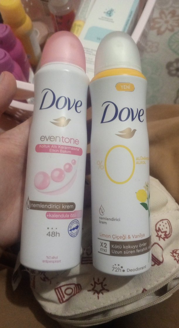 Dove kadın deodorantları, 48 saat kötü kokuyu önleyen nemlendirici krem içerir. Kalendula özlü ve Limon Çiçeği & Vanilya kokuları, alkol içermez, uzun süre ferahlık sağlar.sarı olan tamamı dolu onun tek fiyatı 80 tl pembe olan ise yarımdan az onun fiyatı da 20 tl