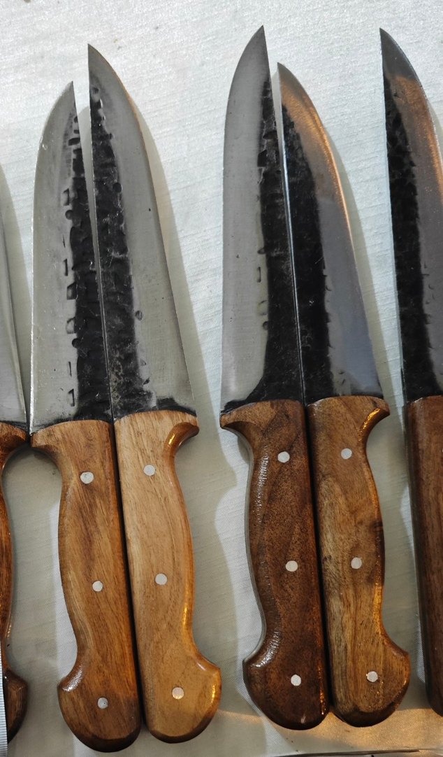 Yatağan Koyu renkli bıçaklar ve metal perçinli kahverengi ahşap saplardan oluşan bıçak seti.