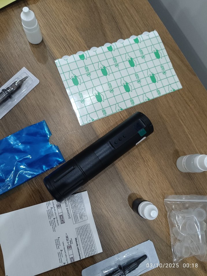 Makine ve set sıfır kullanılmamıştır. 5ml beyaz, 5ml siyah boya, 10ml transfer jeli, 8 adet karışık kartuş iğne, jilet, 1 suni deri, 2 transfer kağıdı, 5 adet pen poşeti, şablon, typce şarj kablosu,2 adet masa matı.