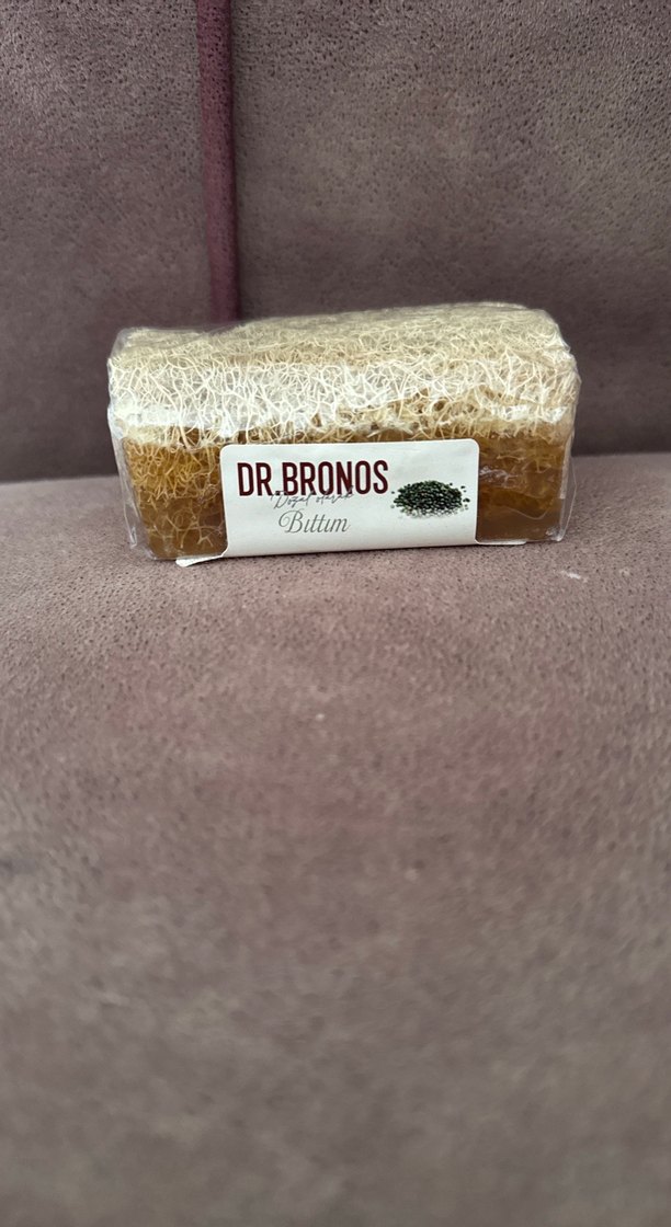 Dr.Bronos Bitüm sabunu, nazik peeling ve temizlik için doğal lif içerir.