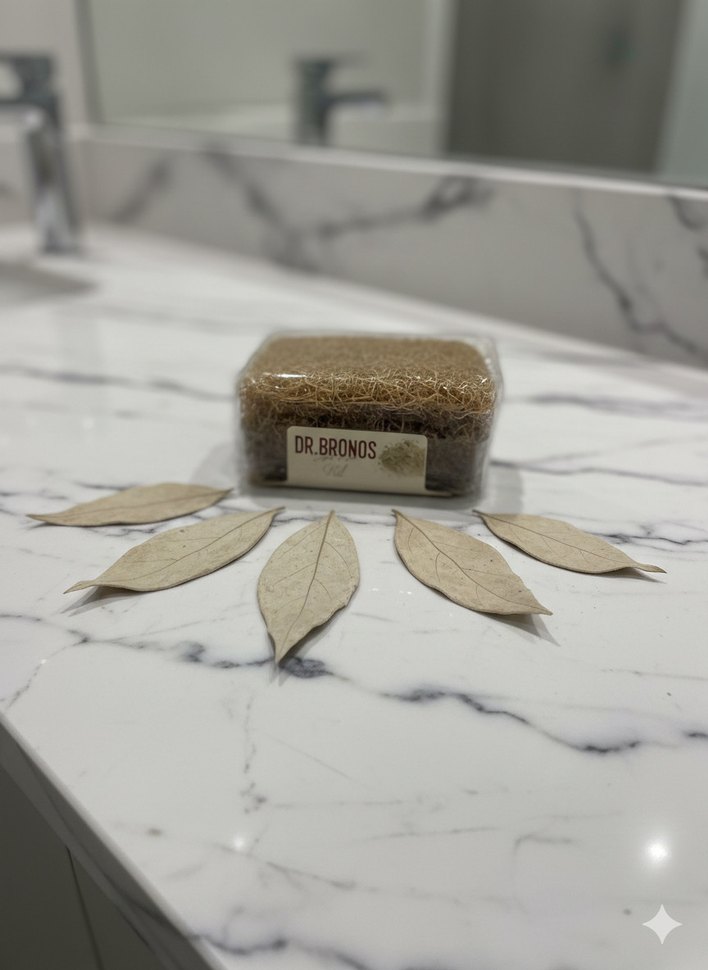 DR.BRONOS doğal sabun, dokulu yüzeyiyle mermer tezgah üzerinde ve dekoratif kuru yapraklarla sunuluyor. Nazik temizlik sağlar.
