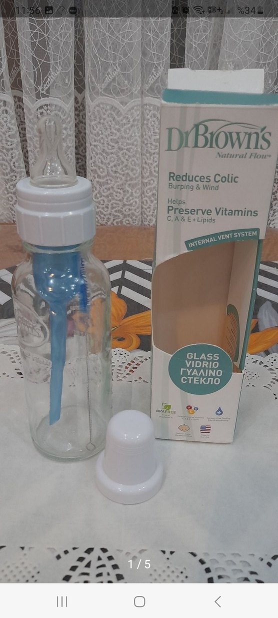 Dr. Brown's cam bebek biberonu, iç havalandırma sistemi ile kolik azaltır ve C, A, E vitaminlerini korur. Beyaz kapak ve silikon emzikli. sifir urun hic kullanilmadi