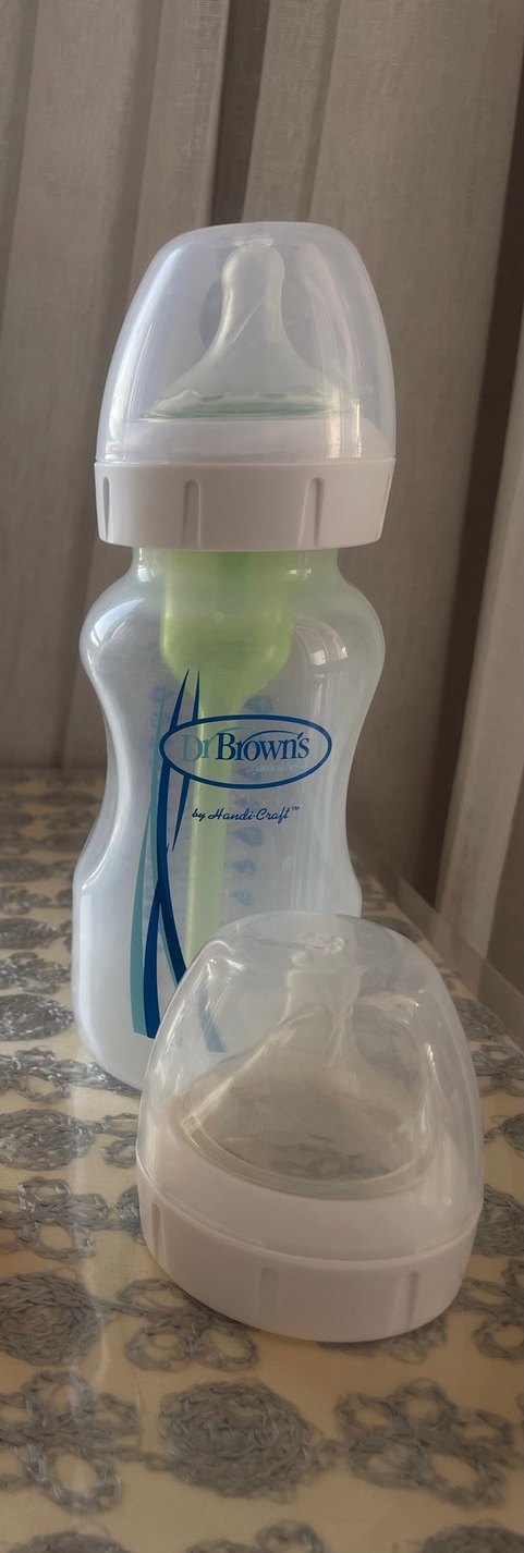 Dr. Brown's beyaz tasarımlı, kolik önleyici havalandırma sistemi içeren 270 ml Pp bebek biberonu. Silikon emzik ve koruyucu kapaklı, yanında yedek biberon emziği ile beraber verilecektir. 1 ay kadar kullanıldı, sorunu, kusuru yoktur.