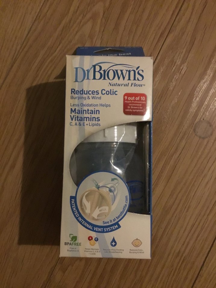 Dr. Brown's mavi bebek biberonu, kolik, geğirme ve gazı azaltan patentli havalandırma sistemi içerir. C, A ve E vitaminleri ile lipidlerin korunmasına yardımcı olur. BPA içermez.