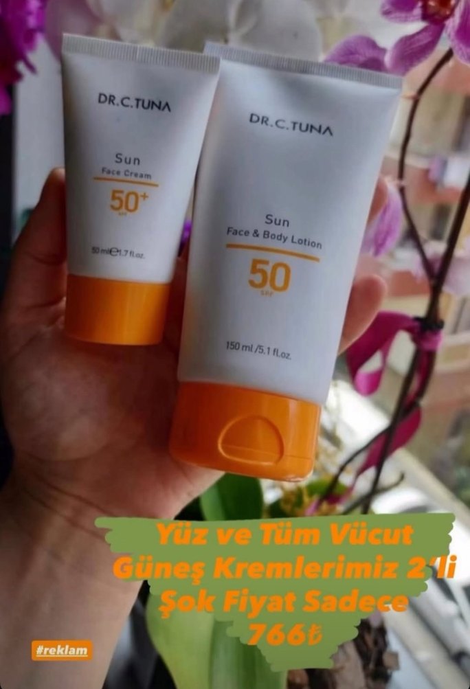 DR.C.TUNA Sun Face Cream SPF 50+ ve Face & Body Lotion SPF 50 içeren yüz ve tüm vücut için güneş koruyucu krem seti.
