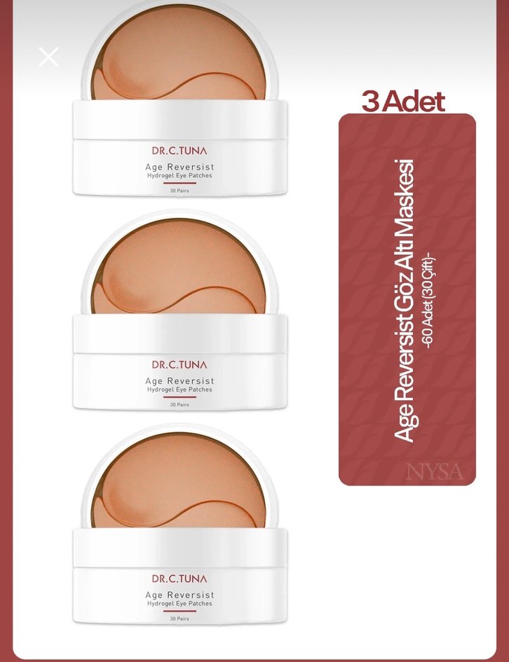 Dr.C.Tuna Age Reversist hidrojel göz maskesi, 3 adet paket halinde, göz altını nemlendirir ve rahatlatır. Her pakette 30 çift bulunur.
