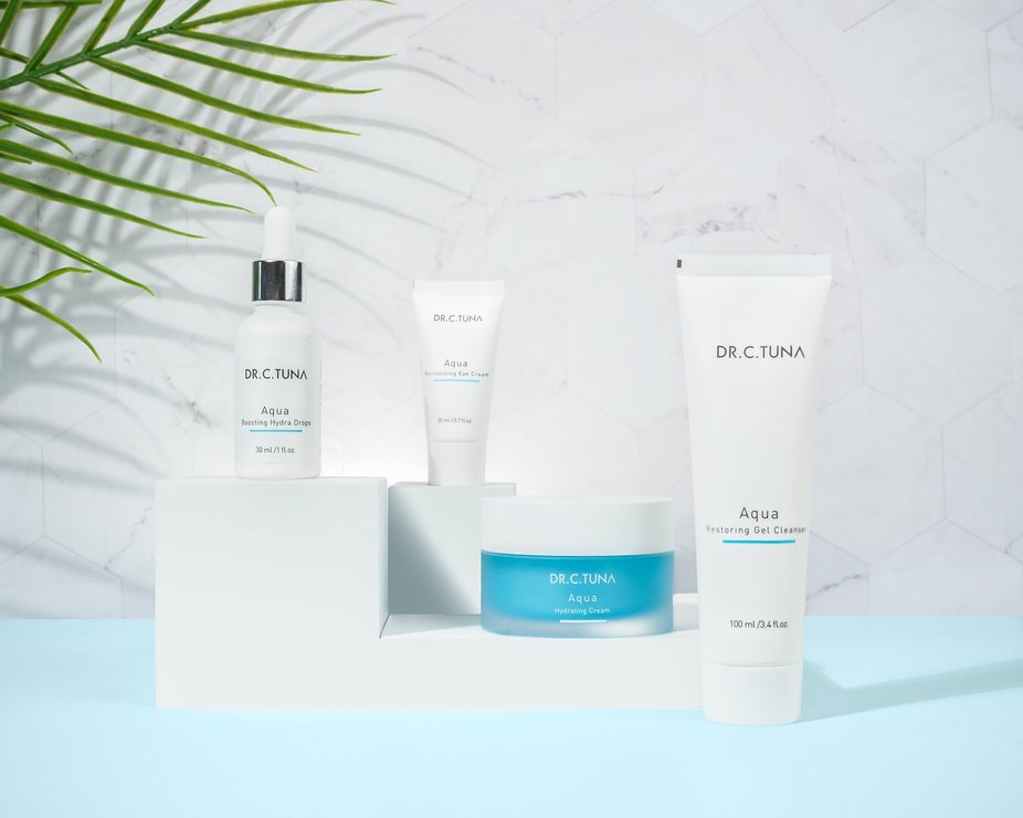 DR.C.TUNA Aqua erkek cilt bakım seti, nemlendirici damlalar, onarıcı jel temizleyici ve nemlendirici krem içerir.