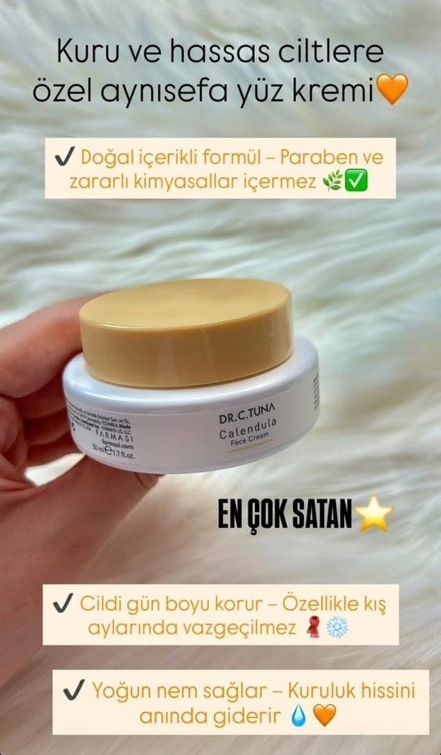 Dr.C.Tuna Calendula yüz kremi, paraben ve zararlı kimyasallar içermeyen doğal formüle sahiptir. Cildi gün boyu korur, özellikle kış aylarında vazgeçilmezdir.
