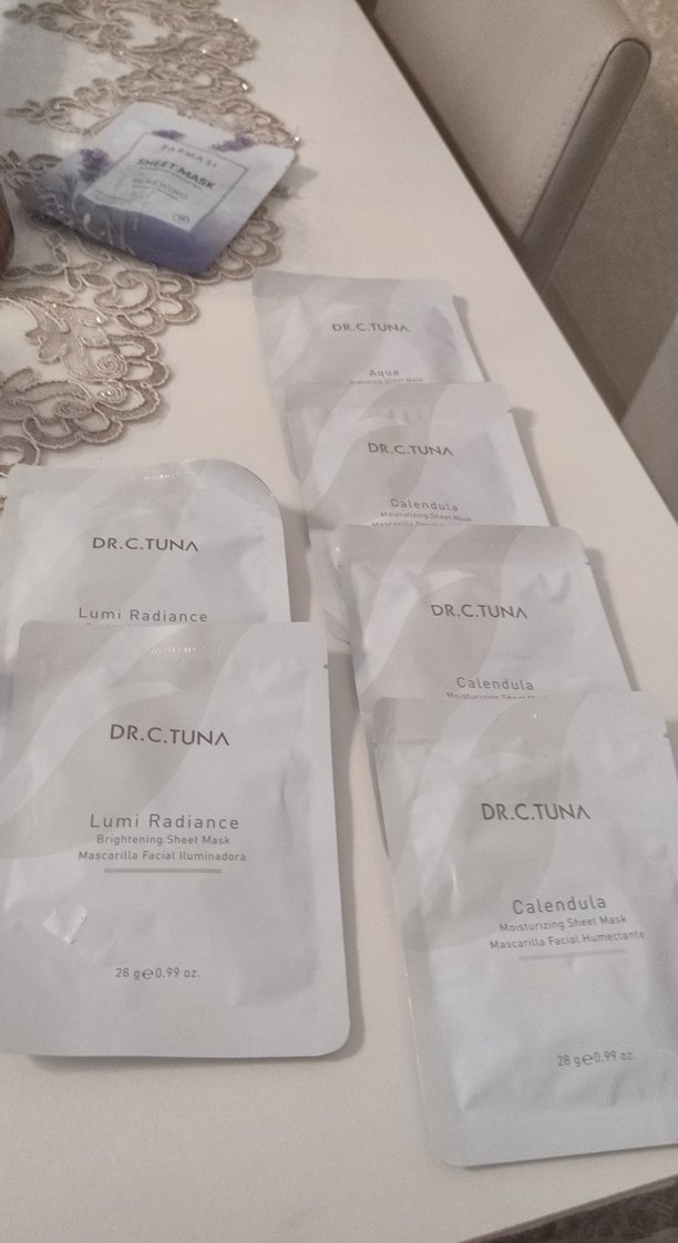 DR.C.TUNA Calendula nemlendirici ve Lumi Radiance aydınlatıcı yaprak maskeleri cilde nem ve parlaklık sağlar. Her maske 28g olup kullanımı kolay paketlerde sunulur.