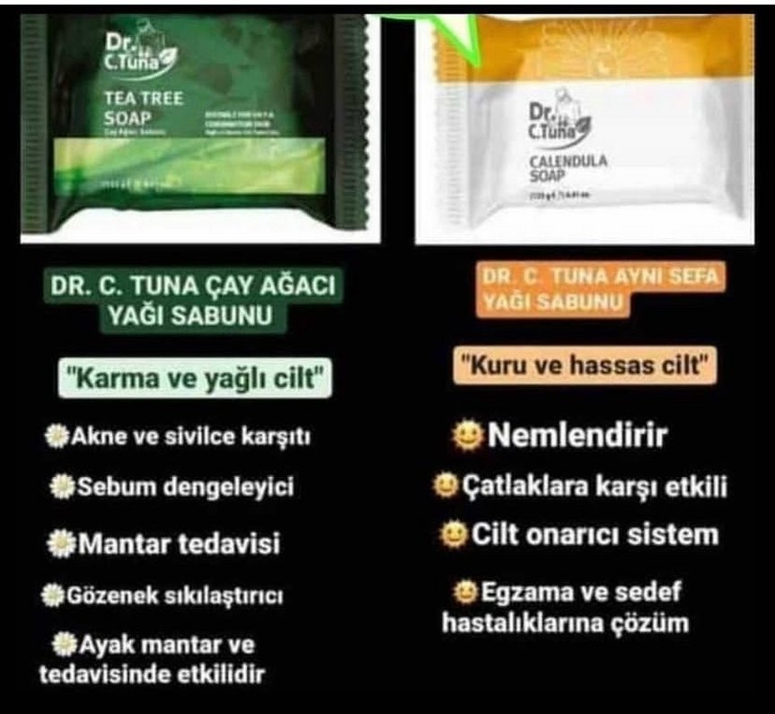 Dr. C. Tuna Çay Ağacı Sabunu yağlı ciltte denge sağlar, sivilce ve mantar tedavisine yardımcı olur. Calendula Sabunu nemlendirir, cilt onarır, egzama ve kuruluğa karşı etkilidir.