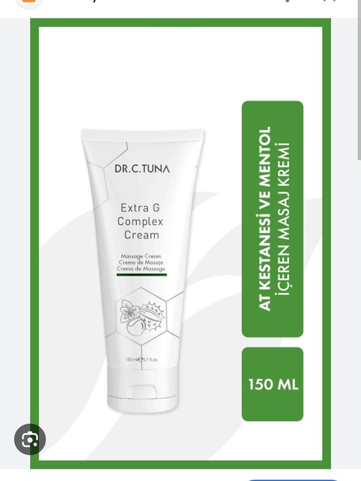 Dr.C.Tuna Extra G Kompleks Krem, at kestanesi ve mentol içeren 150 ml masaj kremidir. Rahatlatıcı bakım sağlar. Düzenli kullanımda bütün eklem ve kas ağrılarını giderir.