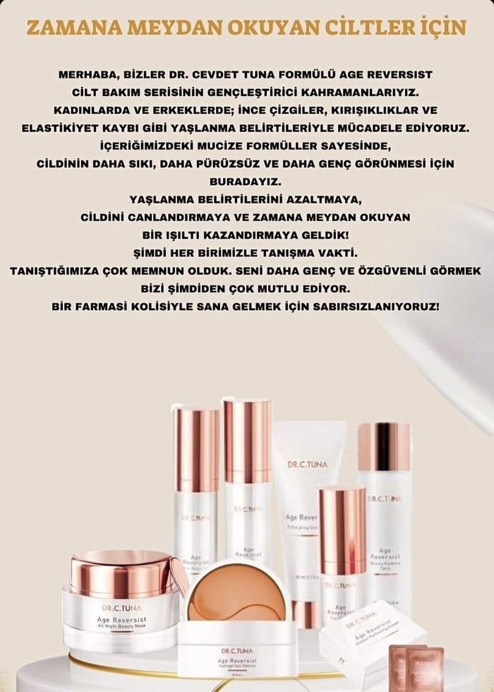 Dr. Cevdet Tuna Formül Age Reversist cilt bakım seti, ince çizgiler, kırışıklıklar ve elastikiyet kaybı gibi yaşlanma belirtileriyle mücadele eder. Cildi daha sıkı, pürüzsüz ve genç gösterir.