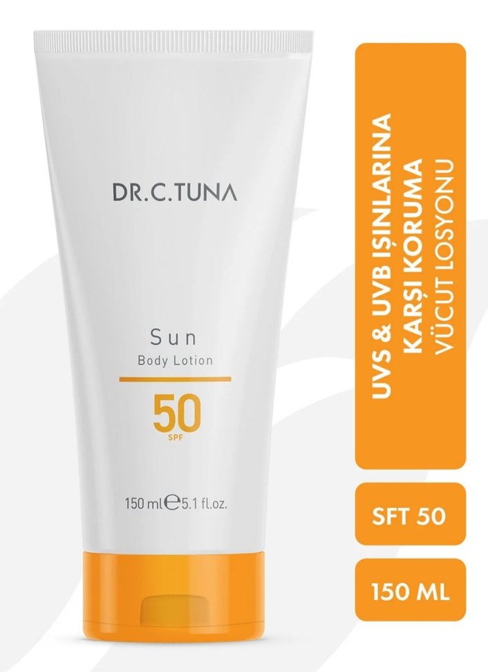 Dr.C.Tuna Güneş Losyonu SPF 50 ile UVB ve UVA ışınlarına karşı koruma sağlar. 150 ml tüpte sunulur ve cildinizi etkili şekilde korur. ☀️ #drtuna #vucutlosyonu