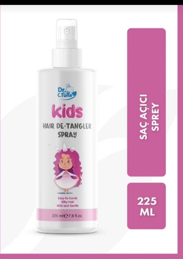Dr. C. Tuna Kids Saç Açıcı Sprey, saçları nazikçe yumuşatır ve kolay tarama sağlar. Çocuklar için hafif ve naziktir. 225 ml.