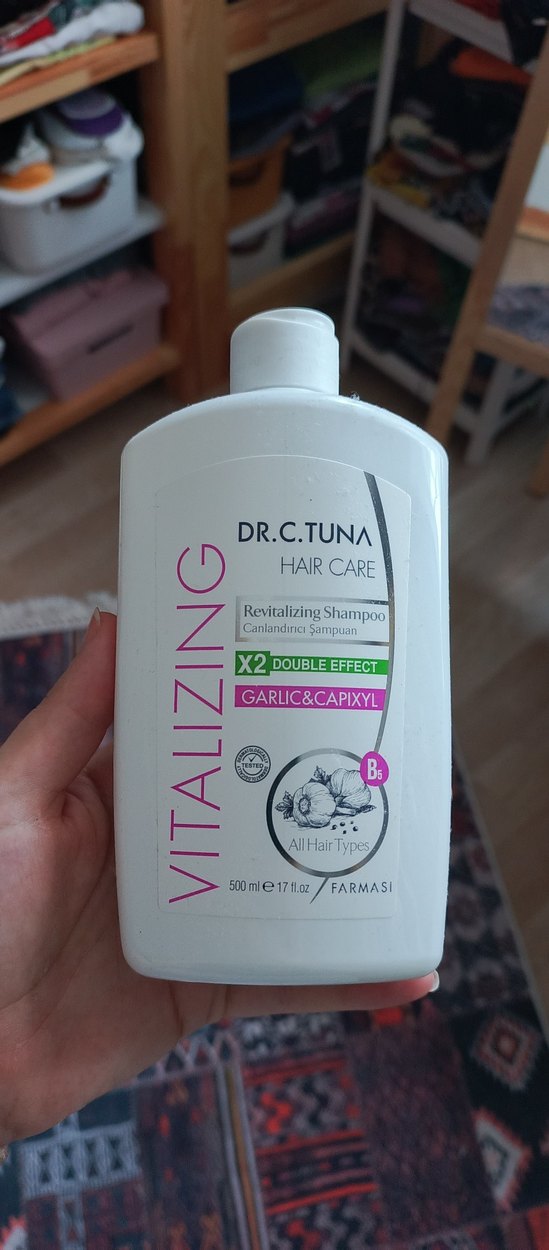 Dr.C.Tuna sarımsak ve Capixyl içeren canlandırıcı şampuan, tüm saç tipleri için çift etkili formüle sahiptir. 500 ml şişede sunulur.