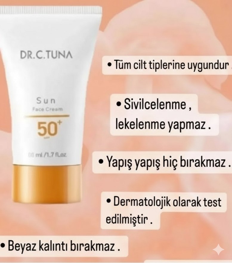 Dr.C.Tuna SPF 50+ güneş koruyucu yüz kremi, tüm cilt tiplerine uygundur. Dermatolojik olarak test edilmiştir, sivilce yapmaz, leke bırakmaz ve yapış yapış kalıntı oluşturmaz. 50 ml.