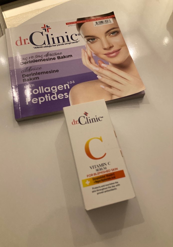 dr.Clinic C vitamini serumu, leke problemi olan ciltler için koruyucu ve besleyici özellikler içerir, peptitler ve kollajen ile desteklenmiştir.