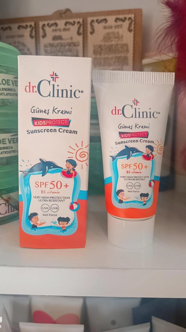dr.Clinic KidsProtect güneş kremi, SPF 50+ ve B5 vitamini ile çocukların hassas cildi için çok yüksek koruma sağlar. Suya dayanıklıdır, UVA ve UVB ışınlarına karşı korur.