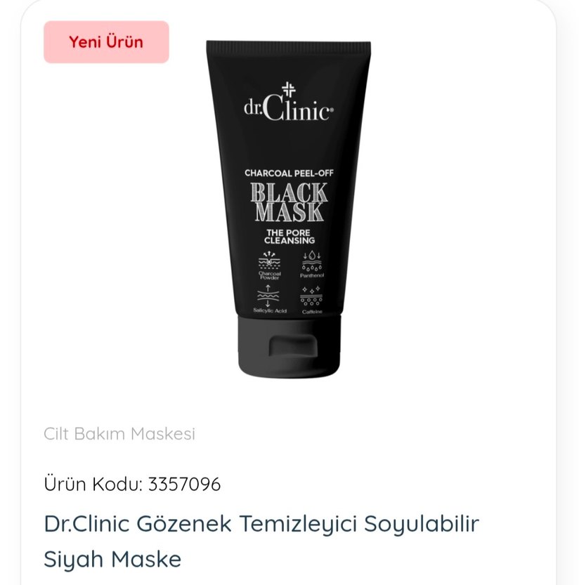 dr.Clinic Siyah Soyulabilir Maske, kömür ve salisilik asit ile gözenekleri derinlemesine temizleyerek kir ve fazla yağı giderir.