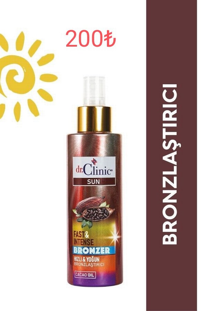 Dr.Clinic Sun bronzlaştırıcı sprey, kakao yağı ile hızlı ve yoğun bronzluk sağlar.