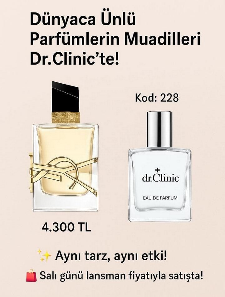 Dr.Clinic kadın parfümü, dünyaca ünlü parfümlere benzer tarz ve etkiye sahip. Eau de Parfum, 50 ml. Lansman fiyatıyla satışta.