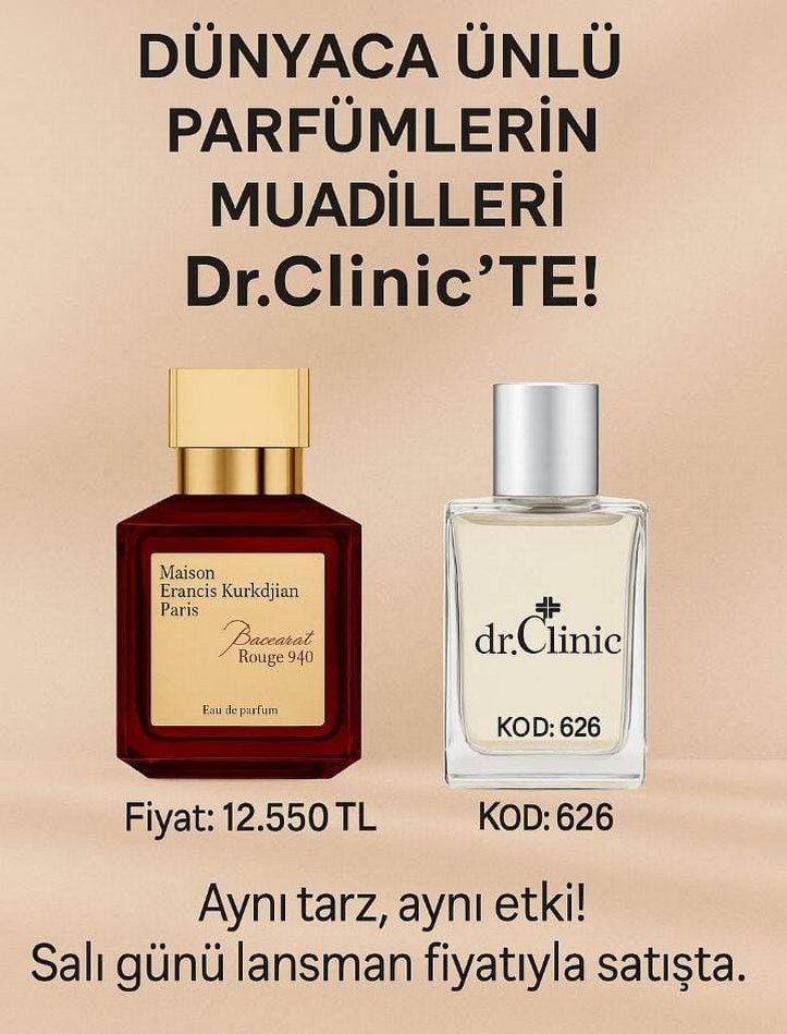 Dr.Clinic kadın parfümü KOD:626, dünyaca ünlü Maison Francis Kurkdjian Baccarat Rouge 940 ile aynı tarz ve etkiye sahiptir. Lansman fiyatıyla satışta.