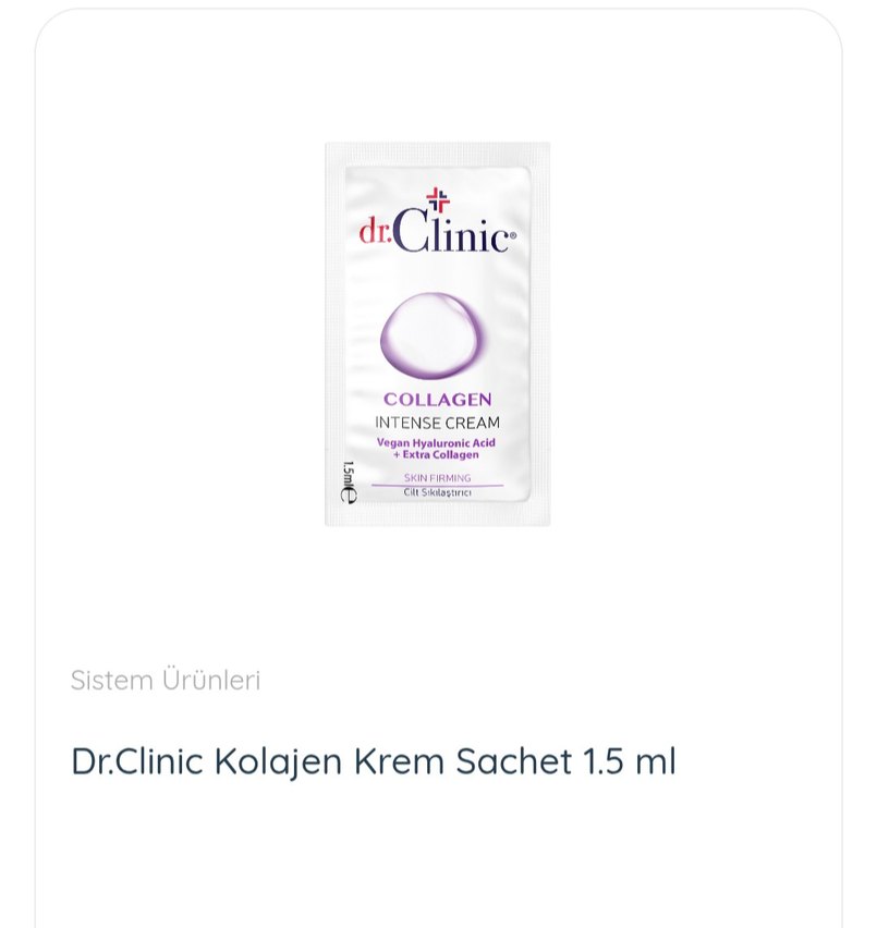 Dr.Clinic Kolajen Yoğun Krem, 1.5 ml sachette vegan hyalüronik asit ve ekstra kolajen içerir, cildi sıkılaştırmaya yardımcı olur.