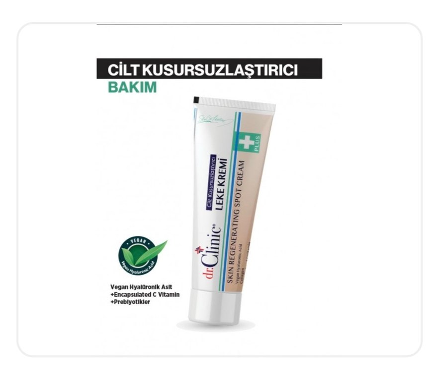 Dr. Clinic leke kremi, vegan hyaluronik asit, prebiyotikler ve kapsüllenmiş C vitamini içerir, cildi yeniler ve kusursuzlaştırır.