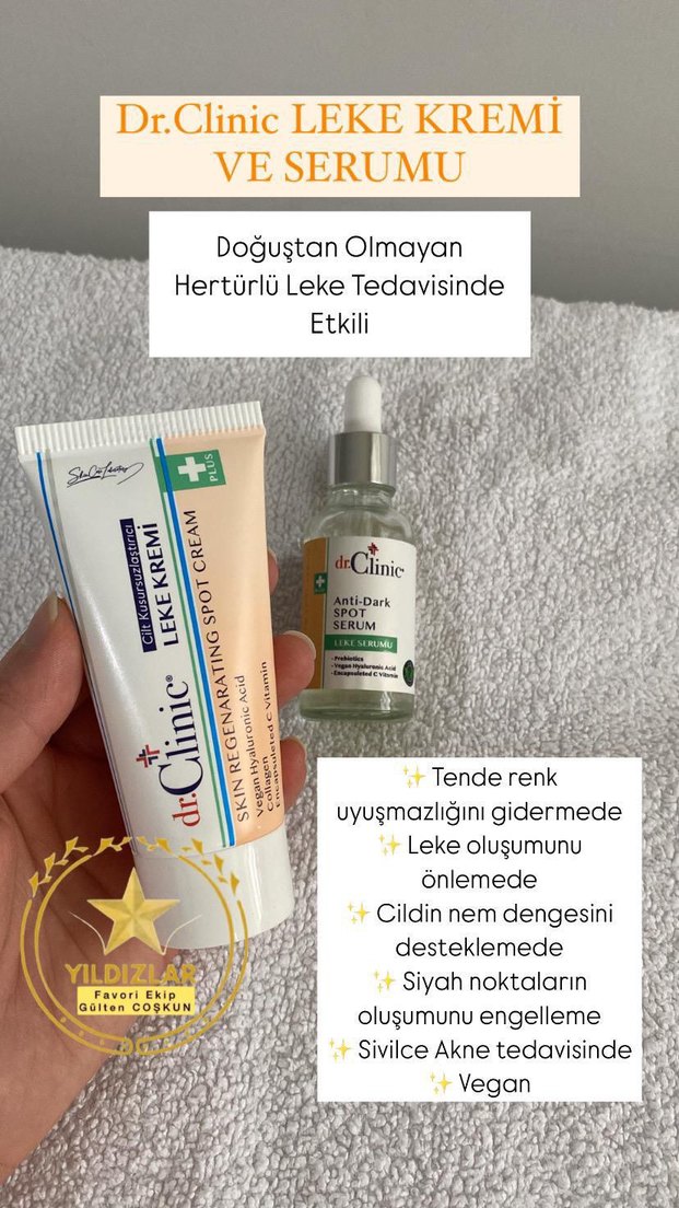 Dr. Clinic leke kremi ve serumu, doğuştan olmayan her türlü leke tedavisinde etkilidir. Cildin nem dengesini destekler, leke oluşumunu önler, siyah noktaların oluşumunu engeller ve akne tedavisine yardımcı olur. ✨