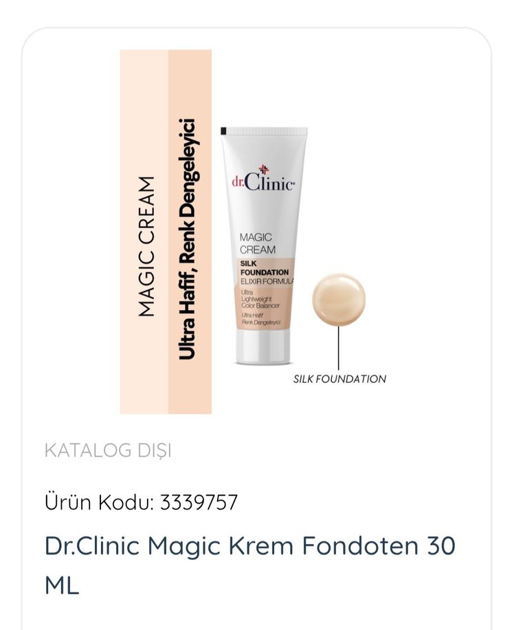 Dr.Clinic Magic Krem Fondöten, ipeksi formülüyle ultra hafif kapatıcılık sağlar, cilt tonunu dengeler. Bej renk.