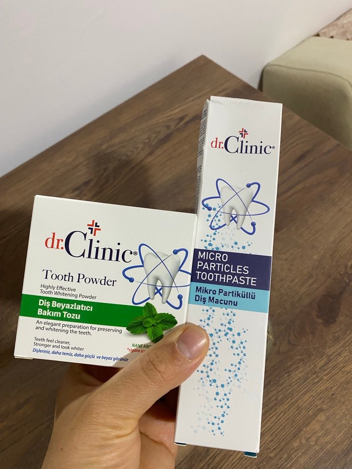 dr.Clinic mikro partiküllü diş macunu ve diş beyazlatıcı bakım tozu, dişleri nazikçe temizleyip güçlendirir ve beyazlatır. Mikro partiküller içerir.