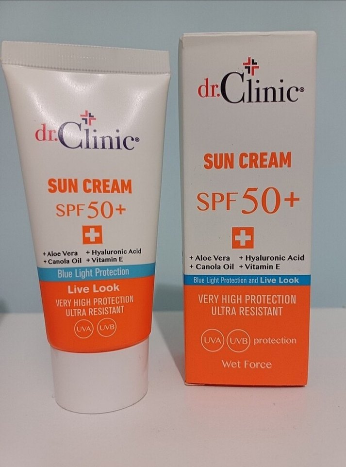 dr.Clinic güneş kremi SPF 50+ ile çok yüksek koruma sağlar. Aloe vera, hyaluronik asit, kanola yağı ve vitamin E içerir. Ultra dayanıklı, mavi ışık korumalı ve ıslak ciltte etkili .