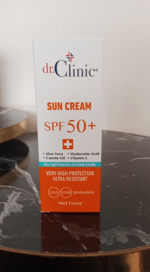 dr.Clinic güneş kremi SPF 50+ koruma sağlar. Aloe vera, hyaluronik asit, kanola yağı ve vitamin E içerir. Çok yüksek UVA ve UVB koruması, ultra dayanıklı ve ıslakken bile etkilidir.