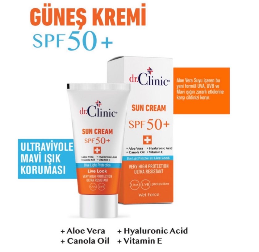 dr.Clinic SPF50+ güneş kremi Aloe Vera, Hyaluronik Asit, Kanola Yağı ve Vitamin E içerir. UVA ve UVB ışınlarına karşı çok yüksek, ultra dirençli koruma sağlar.