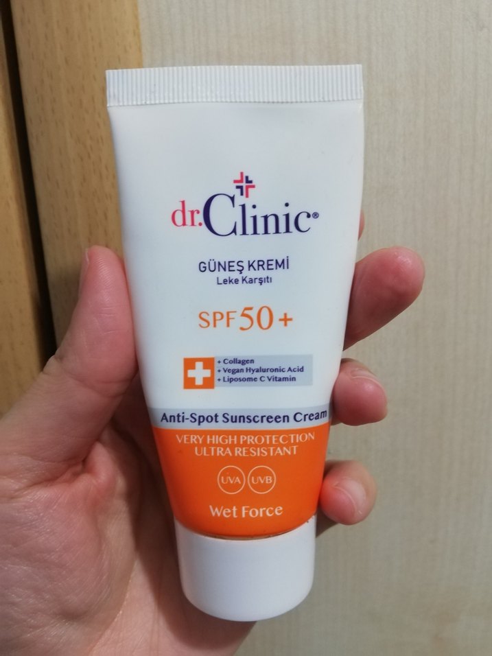 dr.Clinic SPF50+ Leke Karşıtı Güneş Kremi, çok yüksek koruma sağlar, ultra dirençlidir ve kolajen, vegan hyaluronik asit ile C vitamini içerir. Wet Force teknolojisi ile dayanıklıdır. ☀️