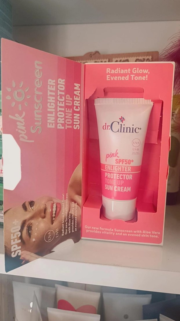 dr.Clinic'in pembe güneş kremi, SPF50+ koruma ve ton eşitleyici özelliklerle cildi parlak ve eşit tonlu yapar. Aloe Vera içerir. ☀️