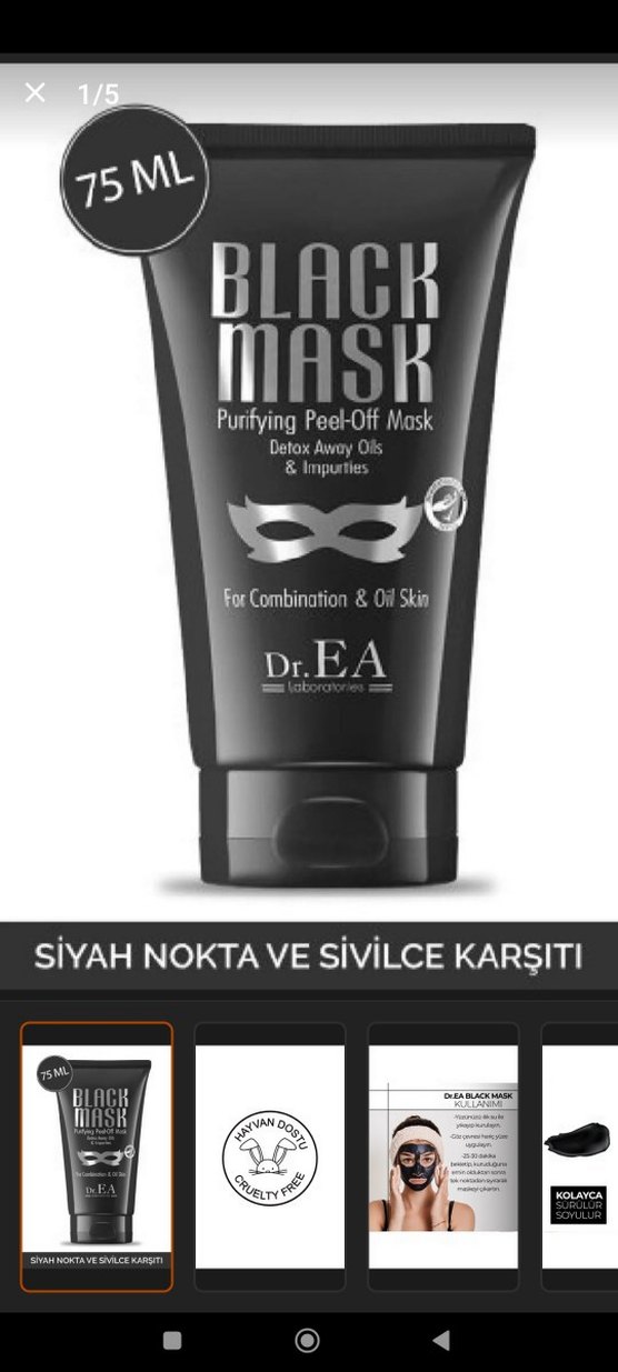 Dr.EA Siyah Maske, kombinasyon ve yağlı ciltler için yağları ve kirleri arındıran soyulabilir siyah nokta ve sivilce karşıtı bir maskedir. 75 ml tüpte sunulur