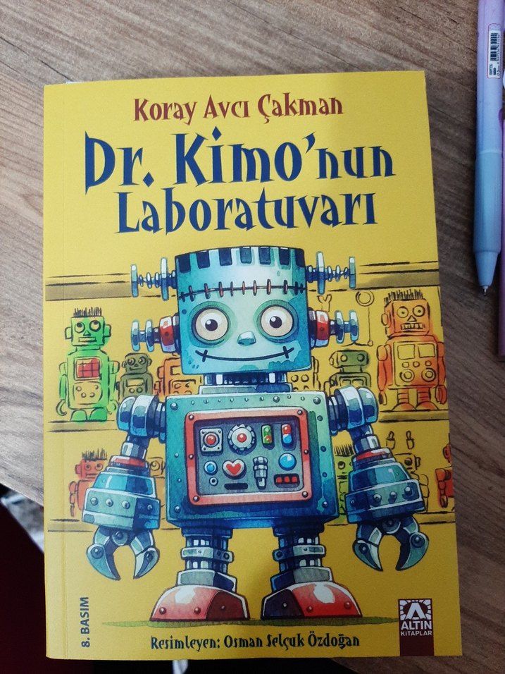 dr. kimo'nun Laboratuvarı " sanat kitabı, sarı zemin üzerinde renkli robot çizimleriyle eğlenceli bir laboratuvar sahnesi sunuyor.