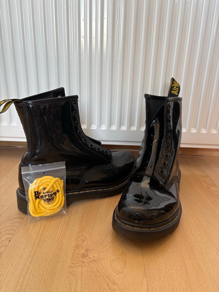 Parlak rugan Dr Martens bot. Londra’dan almıştım. Burnunda az kusur var. Fotografladim. 39 numara ama 38-39 arasi giyenlere tam olur.