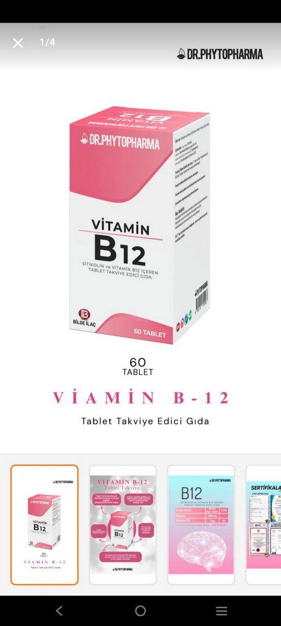 Dr.Phytopharma Vitamin B12 içeren 60 tabletlik takviye edici gıda paketi. Vitamin desteği sağlar.