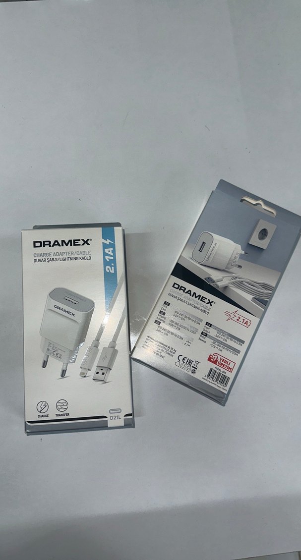 Gri ve beyaz renklerde DRAMEX 2.1A hızlı şarj adaptörü ve kablosu, hızlı ve verimli güç aktarımı sağlar. ⚡