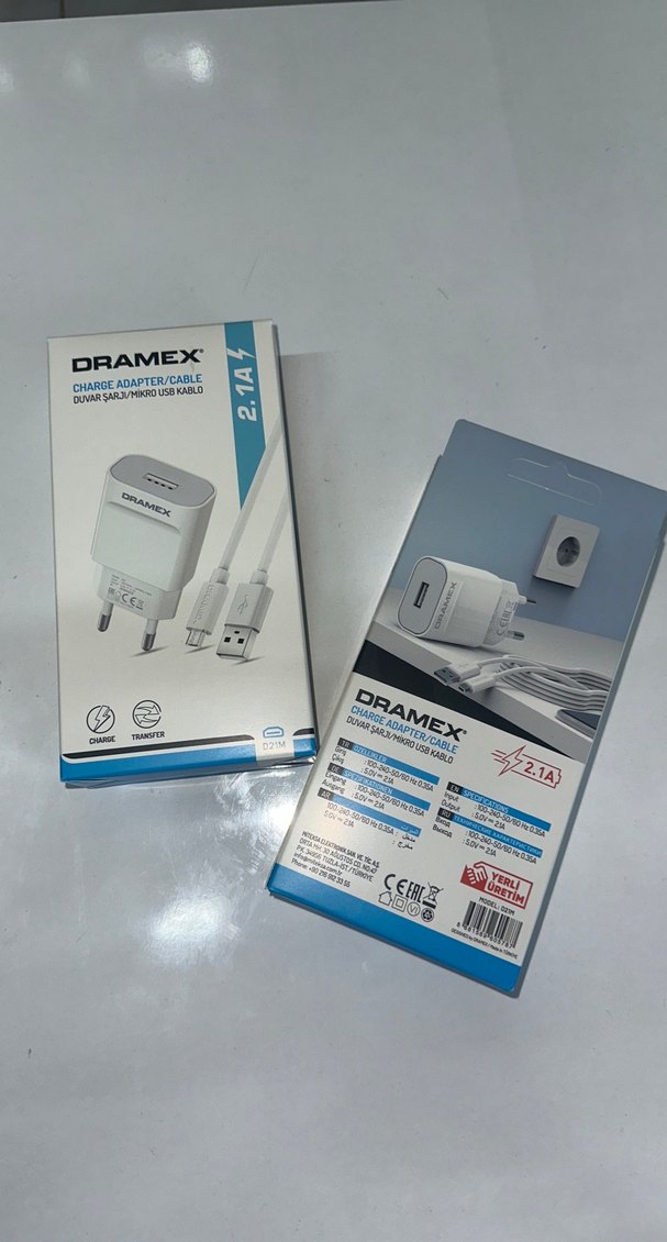 DRAMEX beyaz şarj adaptörü ve mikro USB kablo 2.1A şarj ve veri transferi sağlar. Duvar prizine uyumludur.