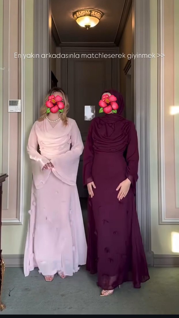 Uzun, mor renkli uçlarında çiçek desenlere sahip , A kesim ve uzun kollu kadın elbisesi. Geleneksel ve şık bir tarz sunar.