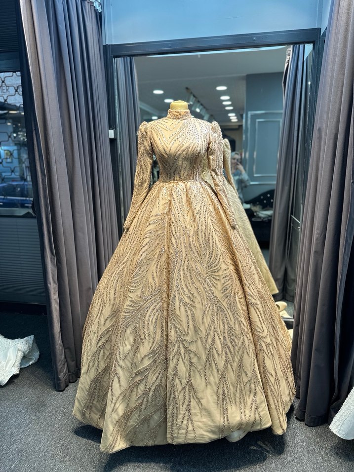 Parlak altın renkli, yüksek yakalı ve uzun kollu işlemeli, drapeli tasarıma sahip klasik kesim Ürünümüz daha önce kullanılmıştır.Arkası ipli olduğu için bedeni ayarlanabilir. İç kısmındaki paylardan da büyütülebilir.36-40 bedene kadar kullanılabilir. ütü veya tadilat gereken ürünler, ütü ve tadilat yapılarak gönderilecektir. Tarlatan dahil değildir. Ek fiyattır. +1000 tl. Bone, tülbent ve hayaltül paketi isterseniz ek ücret +1000 tl. sıfır beş dört dört iki sıfır beş sekiz altı beş altı TOPTAN ALIM İÇİN İLETİŞİME GEÇEBİLİRSİNİZ 2 ÜRÜN VE ÜZERİ TOPTAN FİYAT GEÇERLİ #nişanlık #kınalık #kaftan #gelinlik #gelin