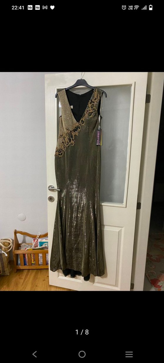 Drapeli ve nakışlı desenlere sahip, v yaka ve kolsuz, parlak altın renkli uzun abiye elbisedir. Klasik ve vintage tarzı bir şıklık sunar, parti için uygundur. ✨