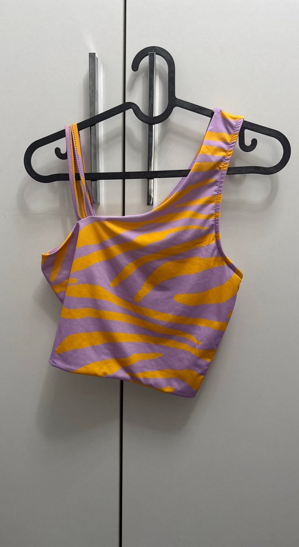 Bu sıkı kesim, pastel mor ve turuncu batik desenli crop top, drapeli ve asimetrik askılı tasarıma sahiptir, sportif sokak stili için uygundur.Sentetik kumaştan oluşmuştur