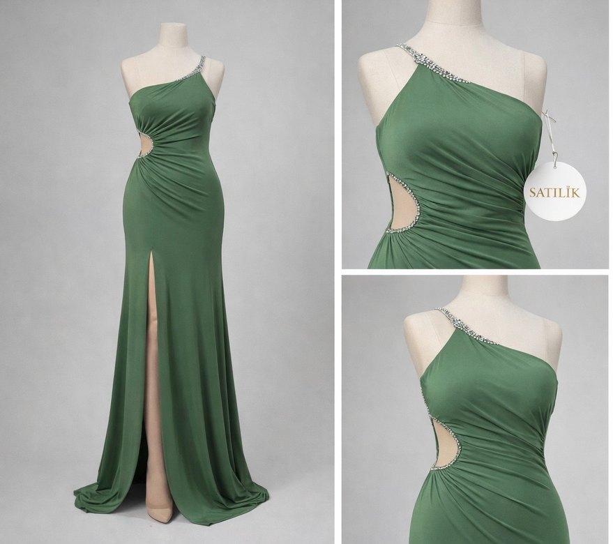 Bu haki midi elbise, drapeli detaylar ve asimetrik, ince askılı yaka ile şık bir kesime sahiptir. Parlak kumaşı ve desenli yapısıyla çağdaş bir tarz sunar, parti için uygundur.